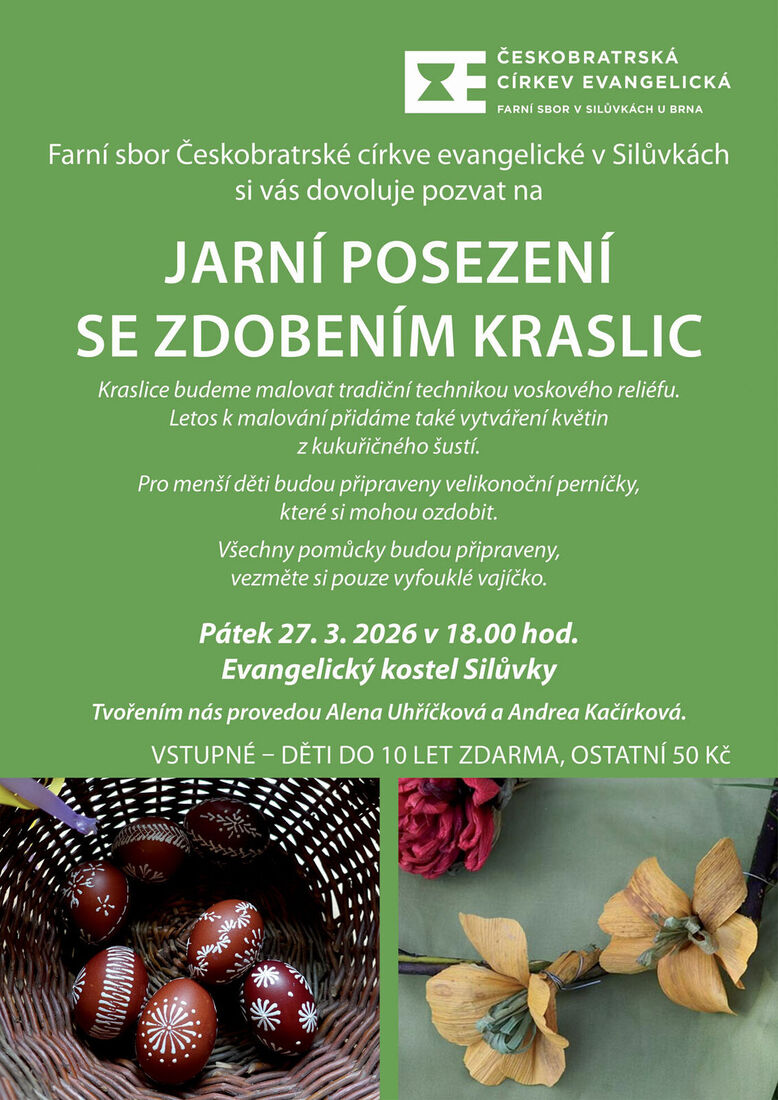 Přijďte v pátek 27. března od 18 hodin posedět a ozdobit si originální velikonoční kraslici. Budeme malovat tradiční technikou voskového reliéfu a zdobit kukuřičným šustím. Přineste jen vyfouklé vajíčko, ostatní pomůcky k dekorování budou připraveny. Menší děti si mohou ozdobit perníčky. Vstupné je 50,- Kč, děti do 10 let zdarma.